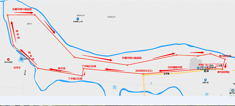 第八屆越野賽舉辦地址佳潔寶老廠區(qū),老廠區(qū)出發(fā)靠輔道一直向西——合河鄉(xiāng)方向——胡韋線斜向上——靠河堤土路上坡返回——栗屯橋返回老廠區(qū)